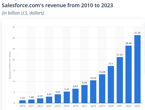 The given data from Statista reveals that the annual revenue from Salesforce is now more than US$30 billion. It also conveys that Salesforce is the leading solution for every company to adopt for better results.